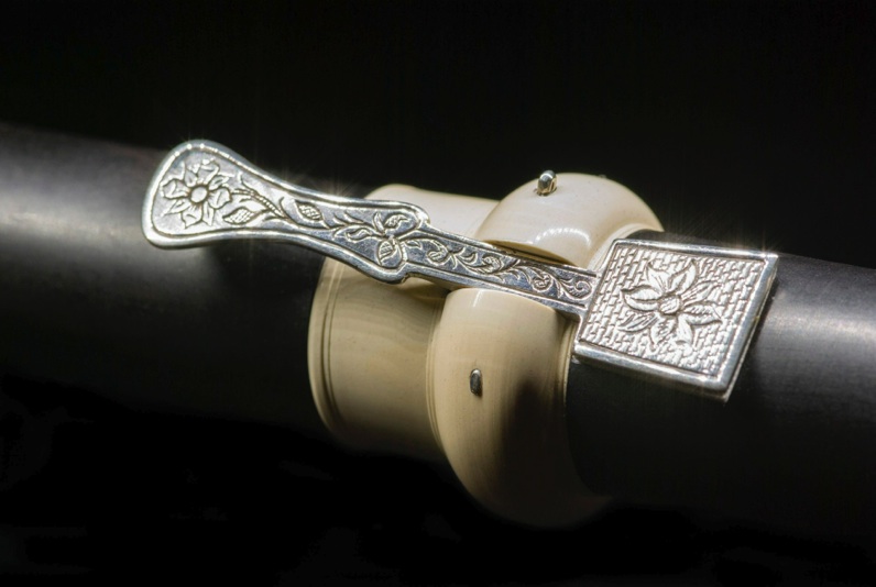 Die Buchsbaumflöte ist mit breiten Elfenbeinringen und einer kunstvoll gravierten Silberklappe ausgestattet.